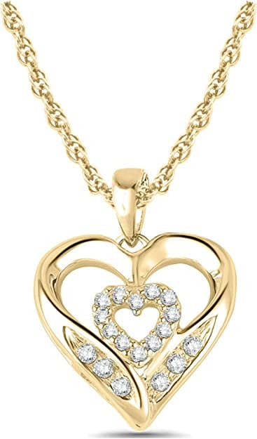 - 10K YELLOW GOLD WITH 1/10ct DIAMONDS AND 18” ROPE CHAIN: Pendant features a 10k yellow gold heart encasing a diamond heart and accented with round white diamonds (1/10 ct) on 18" 10k yellow gold rope chain with spring ring closure