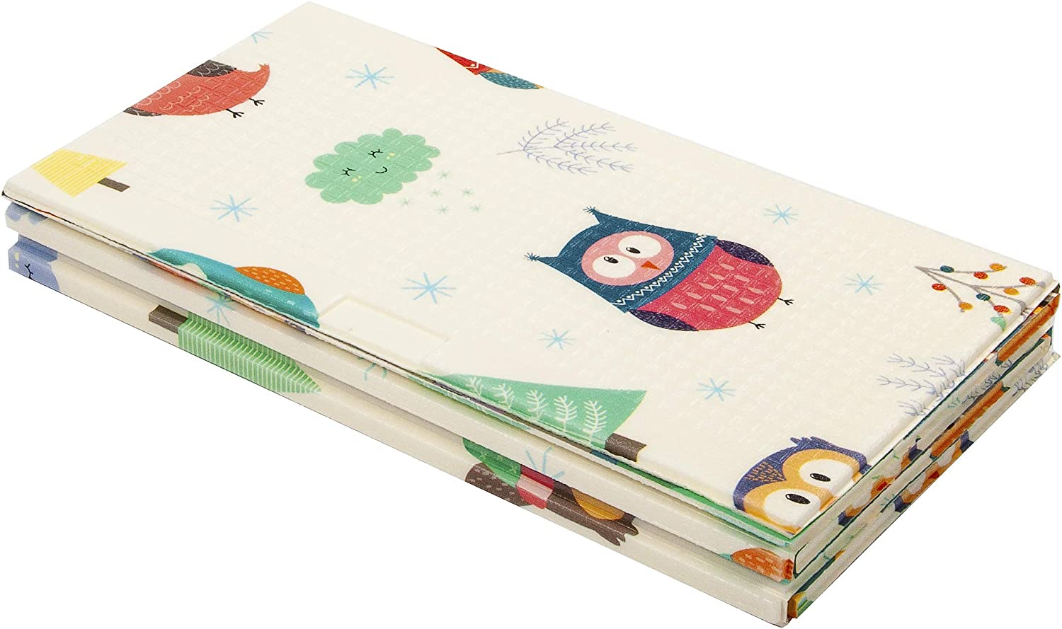 - Double-sided design. Comes with two versions: Animals+Letters and Owls+Cities. Bright color and teaches basic recognition. Full dimensions: 58-inch x 77-inch, 0. 33-inch thick. Folding dimensions: 15. 4-inch x 28. 9-inch, 3. 74-inch thick