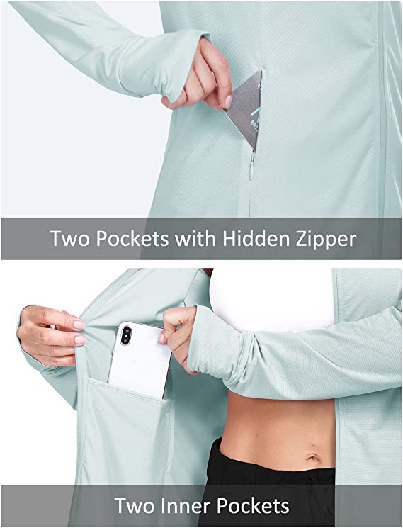 - 2 Side Hidden Zipper Pockets: Women's outdoor sun shirts jackets have 2 side zipper pockets and 2 inner pockets. The pocket is large, half of the space already can hold a 6.7" phone.