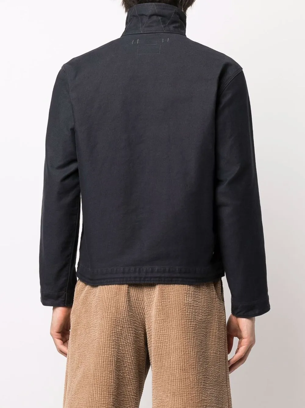 dark navy blue cotton tonal stitching funnel neck front button fastening long sleeves straight hem